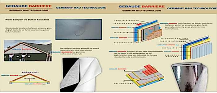 Nem Bariyeri ve Buhar Kesicileri: Günümzde binaların kullanım amacına göre değişik tiplerde ve farklı tasarlanmış çatılar bulunmaktadır.Bu çatıların koruma güvenlik ve enerji tasarrufu için ideal olan çözüm BARRİERE su geçirmez nefes olan örtüleridir. Nem Bariyere nem bariyeri ve buhar kesicilerini kullanım yerleri ve amaçlarına göre farklı gramajlarda üretip proje çözümlerinize sunmaktayız. Gebaude Barriyere ürünleri iki ayrı tiple üretilmektedir.Her iki tipte %100 polipropilen ışıl bağlı ürünler olup son teknoloji ile Avrupa standartlarında üretilmektedir.